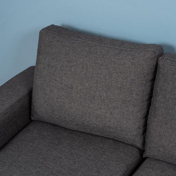 Sofaen er betrukket med slidstærkt gråt møbelstof.