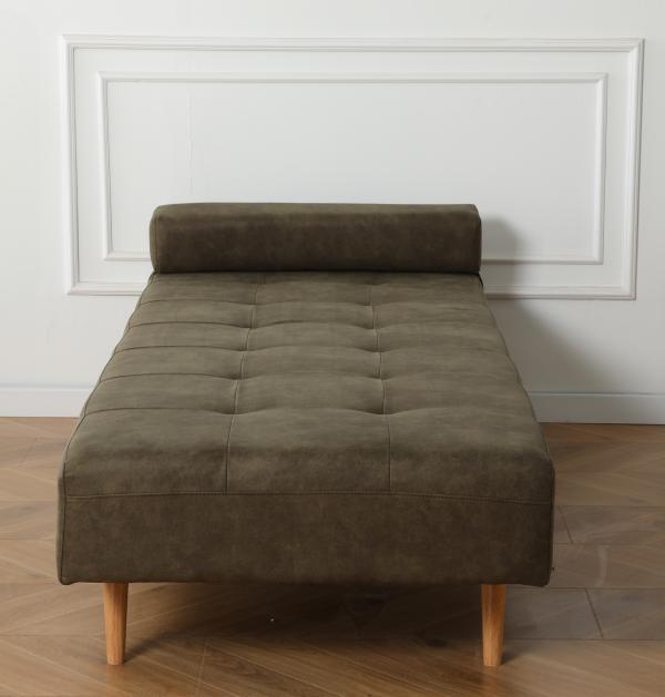 Moderne daybed i mørkegrøn teddystof med bøgetræsben. Aurora daybed er udstyret med en nakkepude som tilføjer yderligere komfort og støtte.