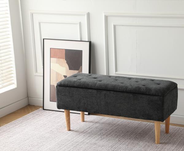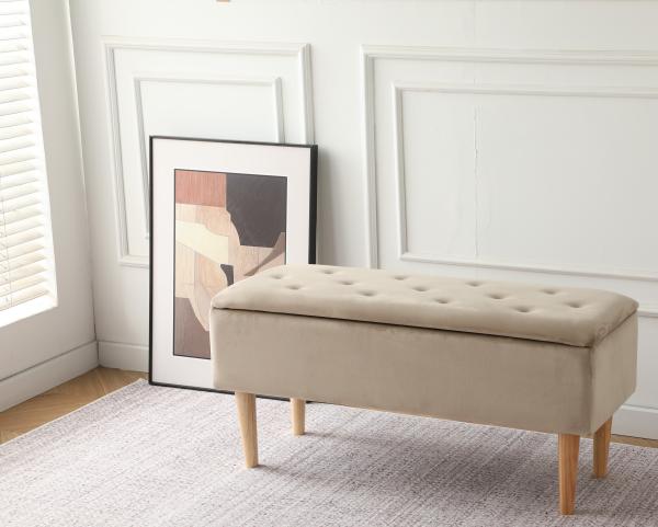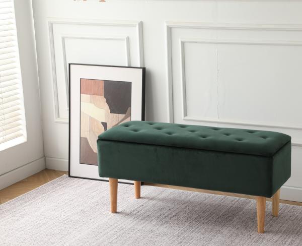 Praktisk polstret blød bænk med opbevaring i sort velour med træ ben. En smart bænk som vil pynte i f.eks. entreen eller soveværelset.