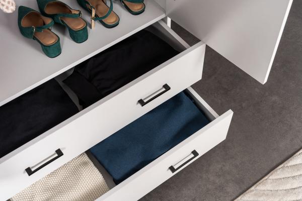 Tidsløst hvidt garderobeskab med 3 døre og 2 skuffer. Skabet er designet til at passe ind i ethvert rum - fra soveværelse til entreen.