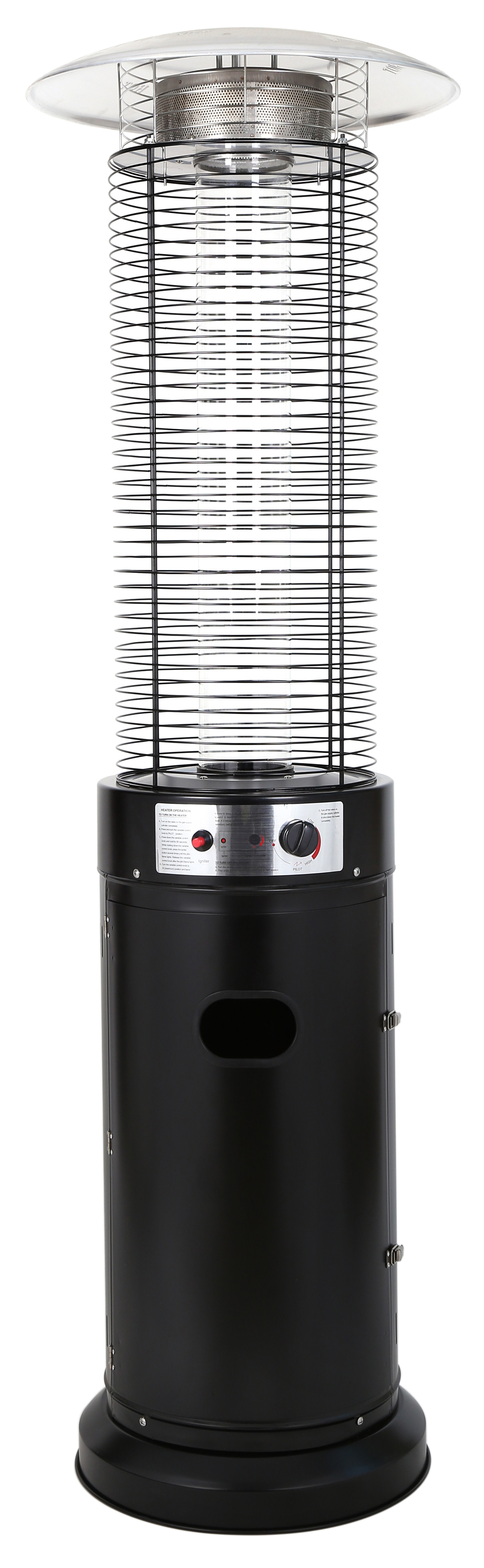Den sorte, pulverlakerede konstruktion giver et eksklusivt udtryk og sikrer samtidig høj holdbarhed. Det beskyttende glasrør omslutter flammen og skaber en 360° varmefordeling, så varmen spredes effektivt omkring området.