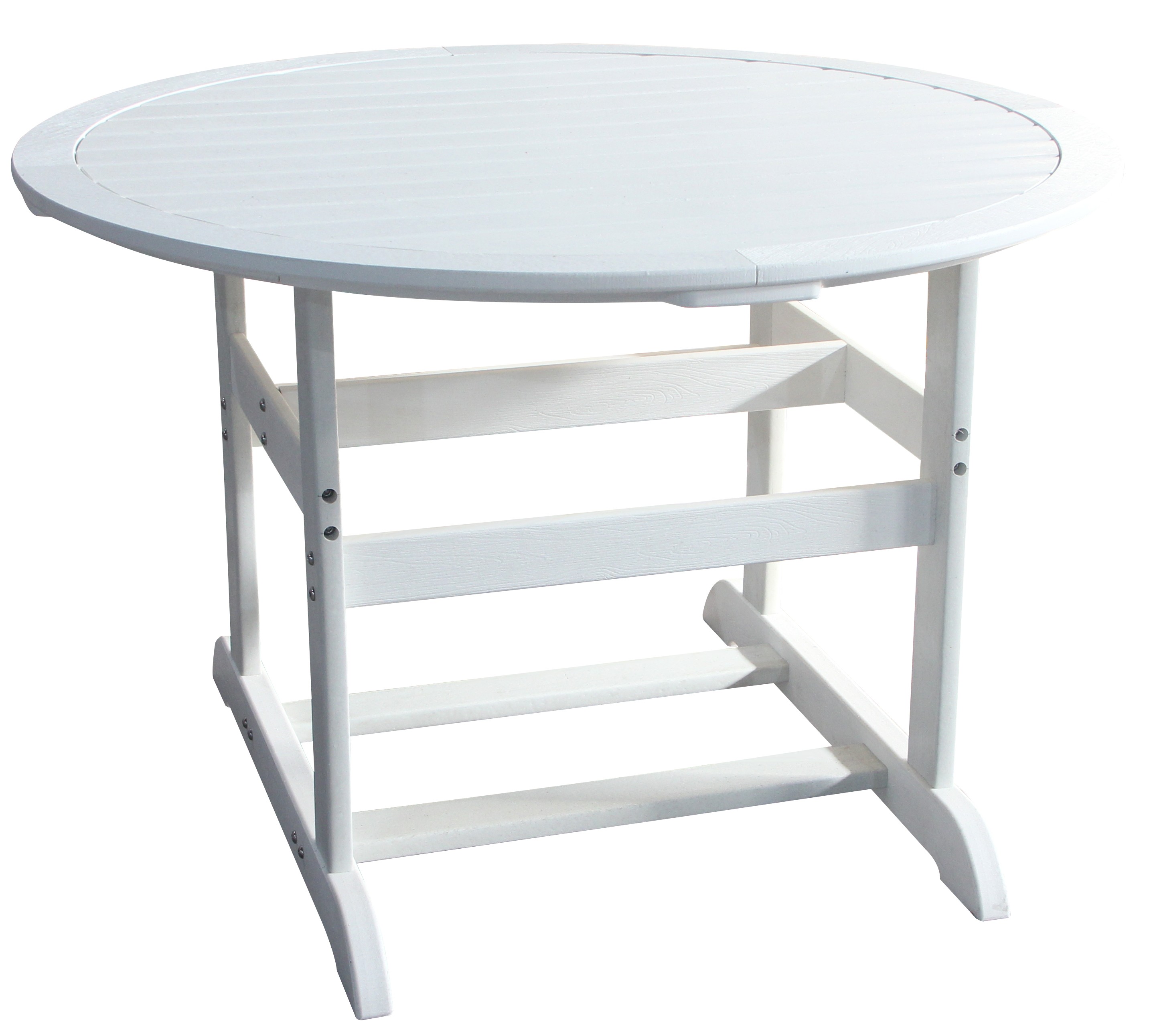 Moderne og stilrent rundt havebord i komposit bidrager til et hyggeligere udendørsmiljø og er modstandsdygtig over for vind og vejr.