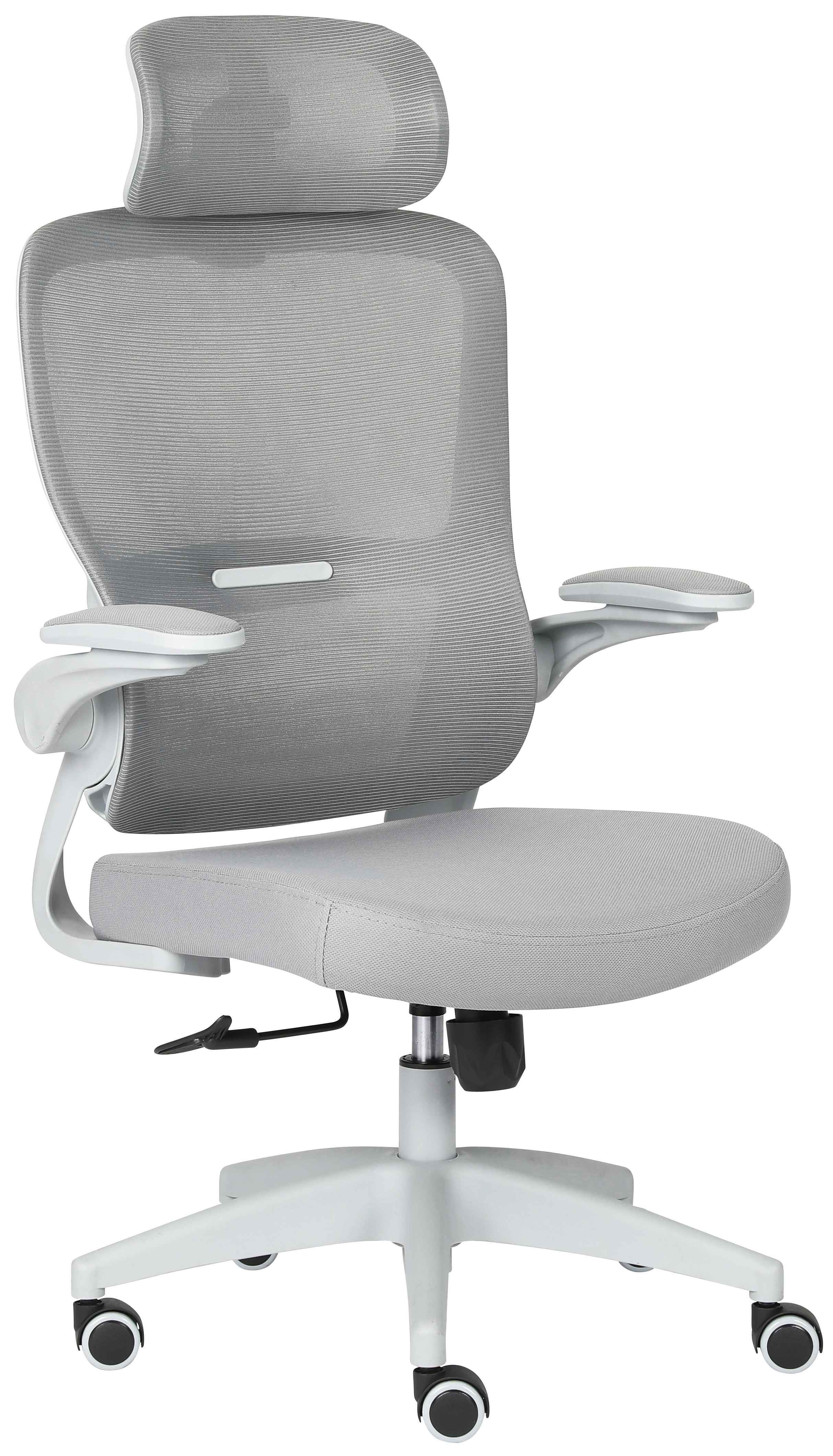 Moderne kontorstol i grå mesh stof med vippefunktion og højdejustering.