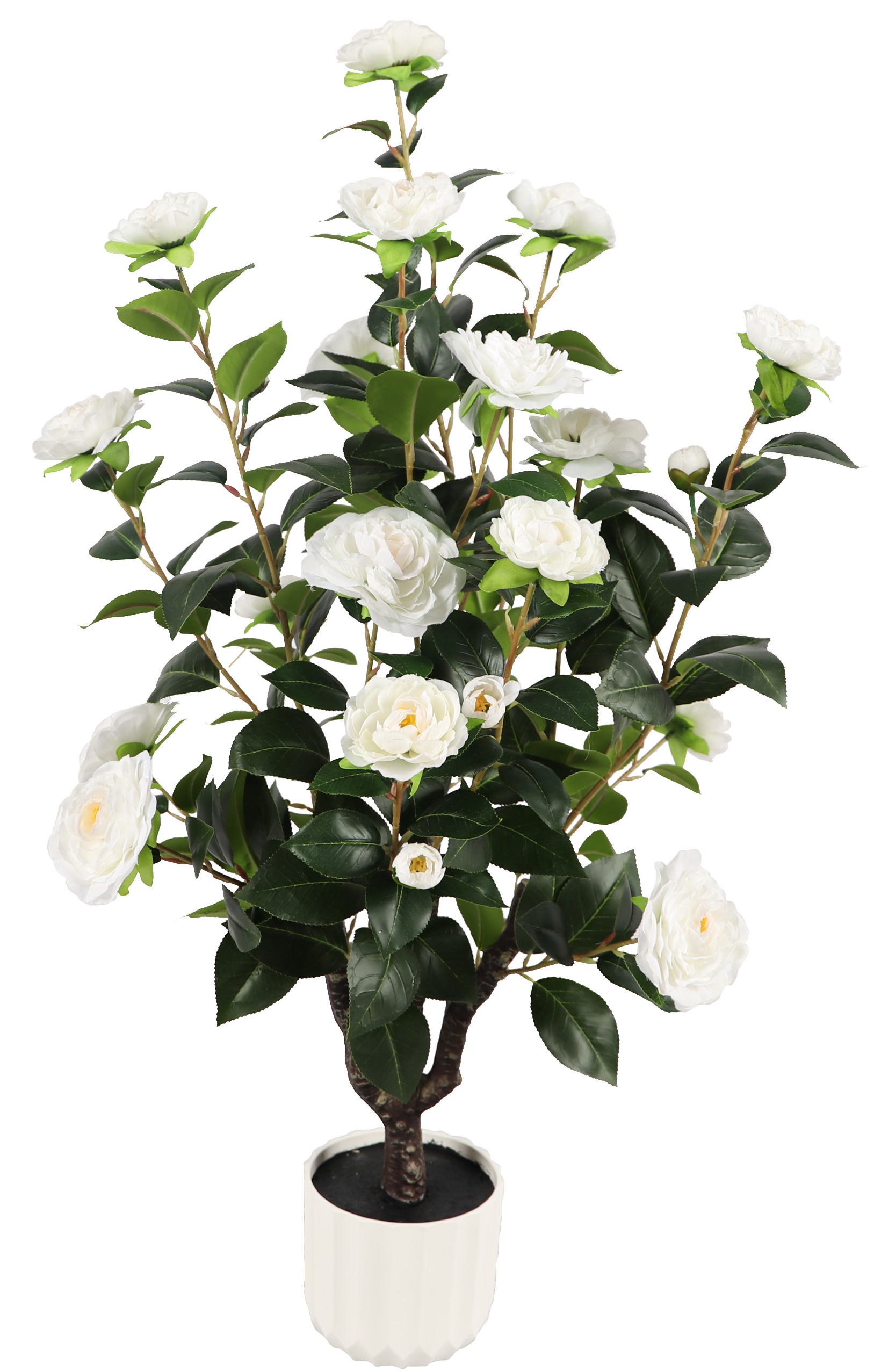 Flot og enkel kunstig kamelia i hvid inspireret af det japanske rosetræ. Den ser naturtro ud og passer ind de fleste steder, både derhjemme og på jobbet.