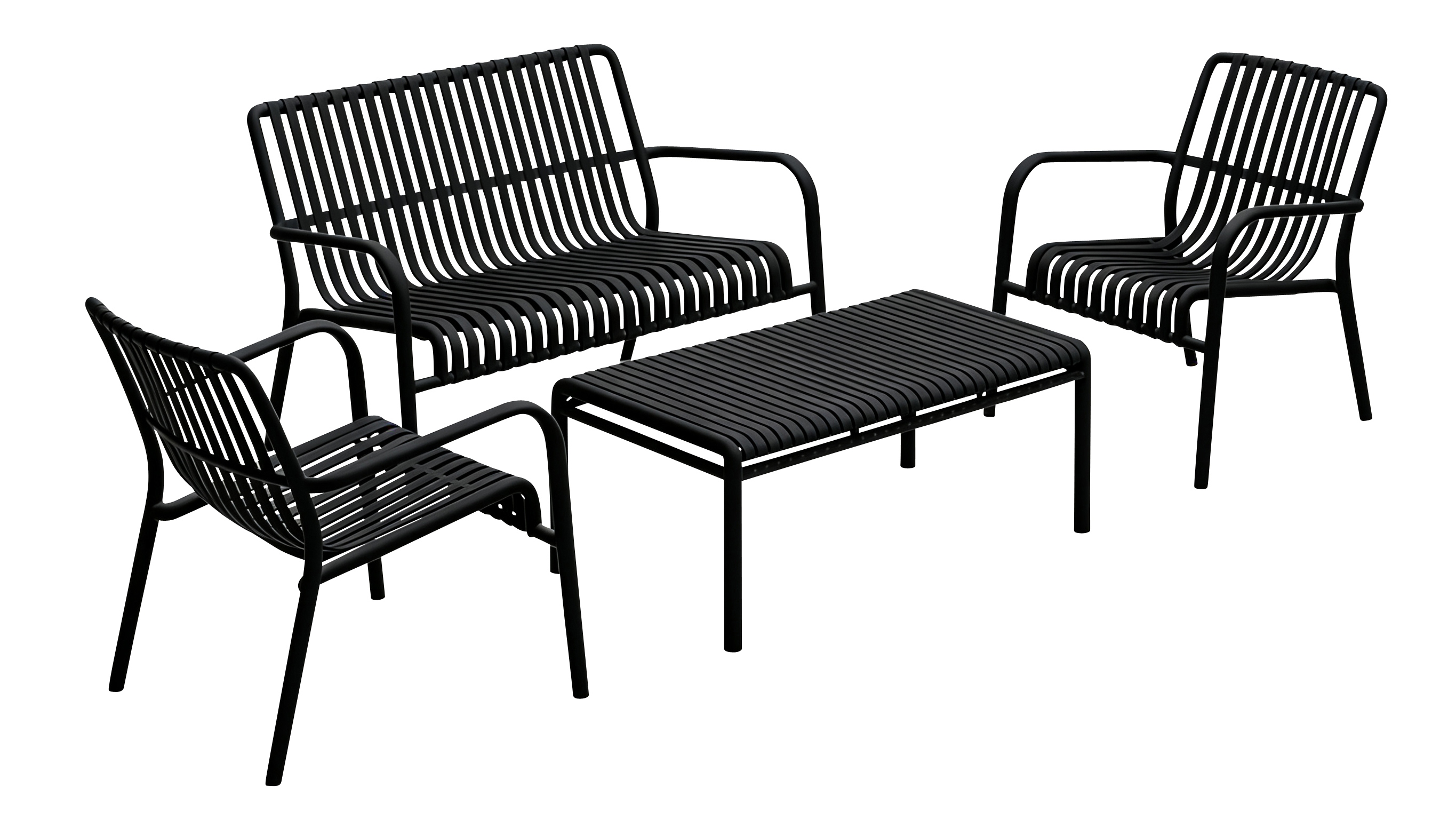 Loungesættet er udført i et minimalistisk look med en robust sort metalramme og et meget karakteristisk ribbet sæde- og ryglæn, som er med til at give et let og luftigt udtryk.