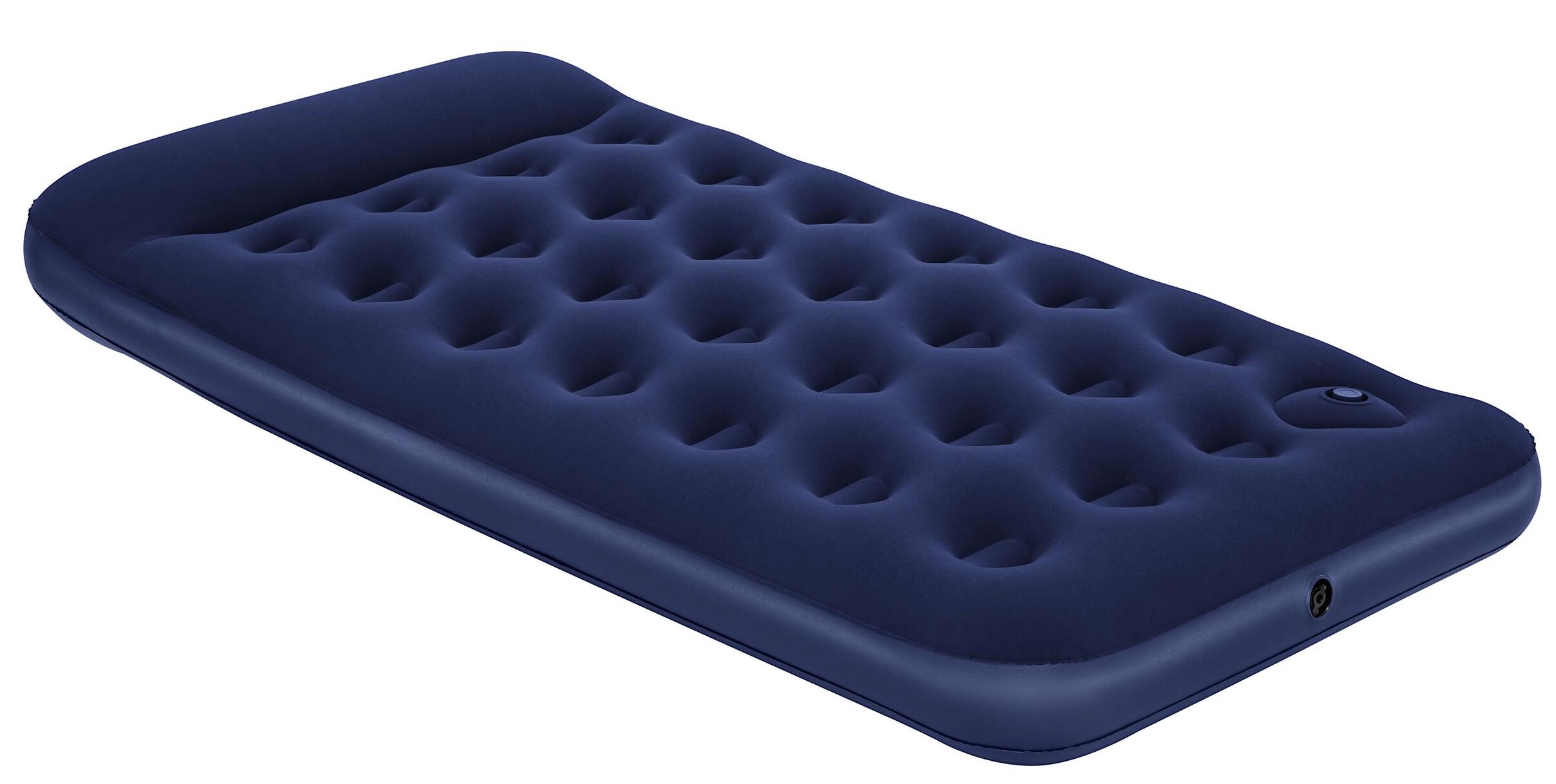 Den blå luftmadras har en velouroverflade, som gør den blød at ligge på.