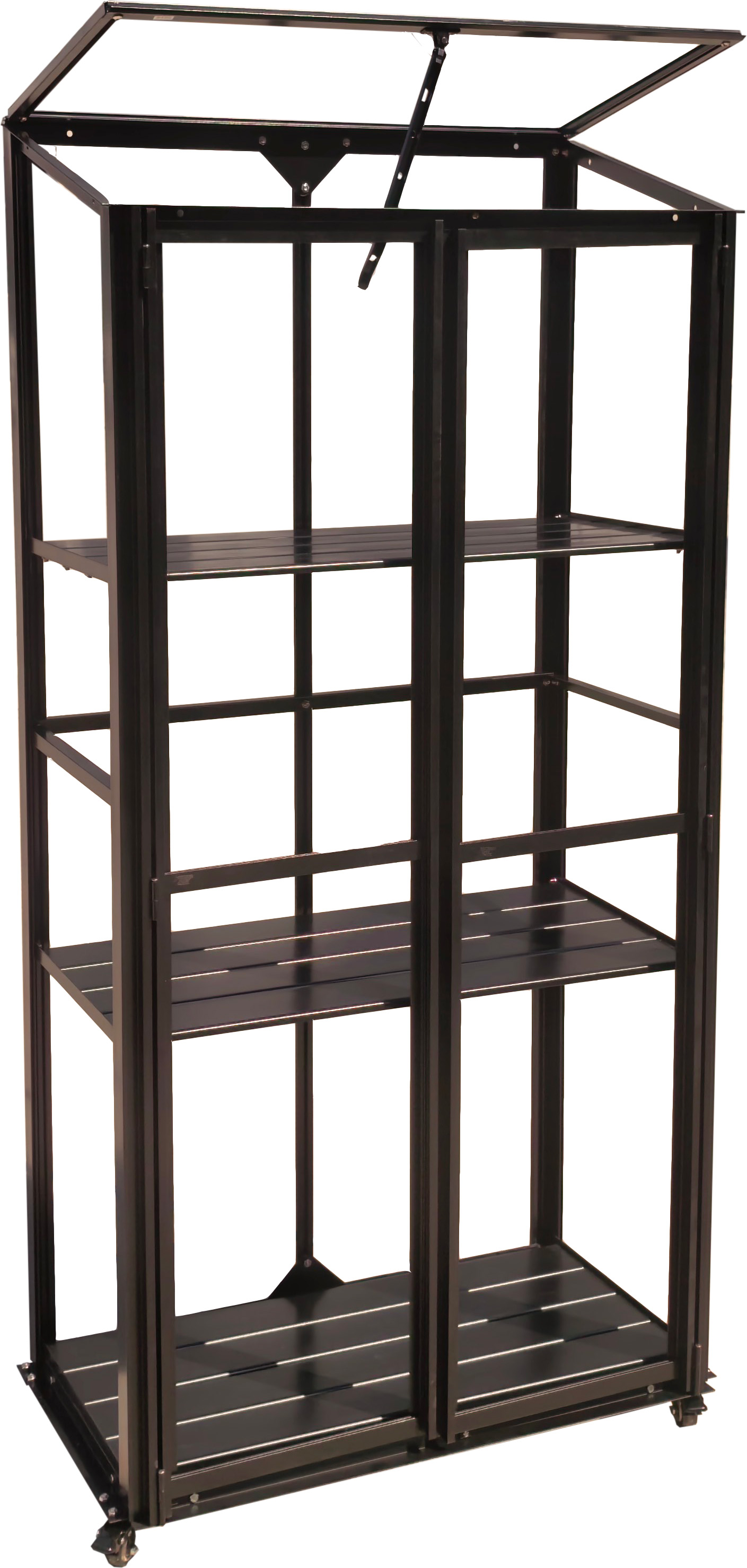 Den har to låger, tre hylde og et oplukkeligt tagvindue, hvilket gør det let at komme til planterne og god mulighed for udluftning