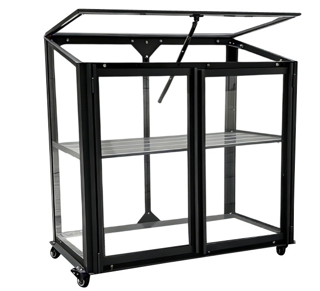 Den har to låger, en hylde og et oplukkeligt tagvindue, hvilket gør det let at komme til planterne og god mulighed for udluftning. Derudover har drivhuset praktiske hjul, så det nemt kan flyttes efter behov.