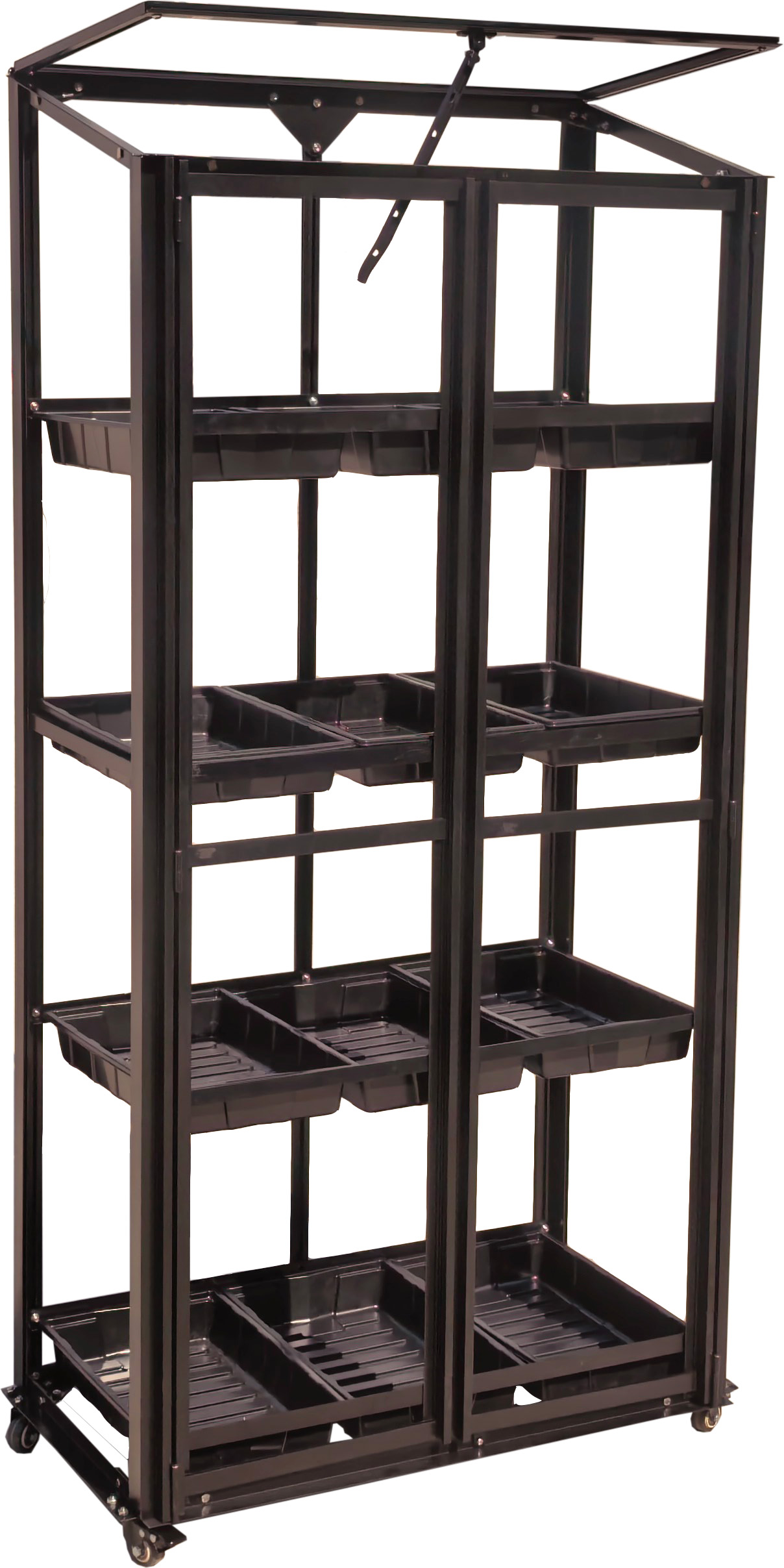 Den har 2 låger, 4 hylder med sårbakker og et oplukkeligt tagvindue. Derudover har drivhuset praktiske hjul, så det nemt kan flyttes efter behov.