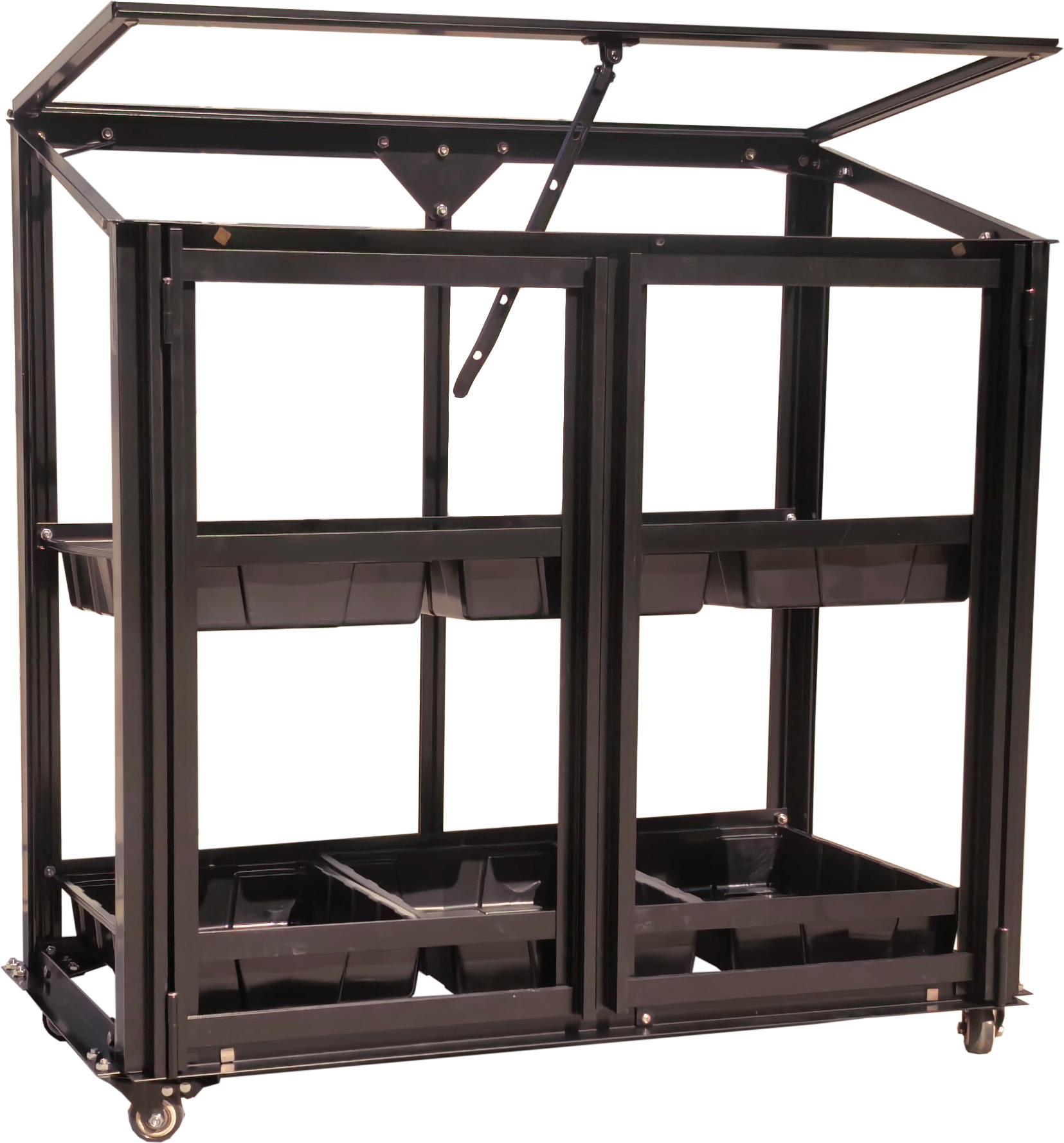 Den har to låger, to hylde med sårbakker og et oplukkeligt tagvindue, hvilket gør det let at komme til planterne og god mulighed for udluftning