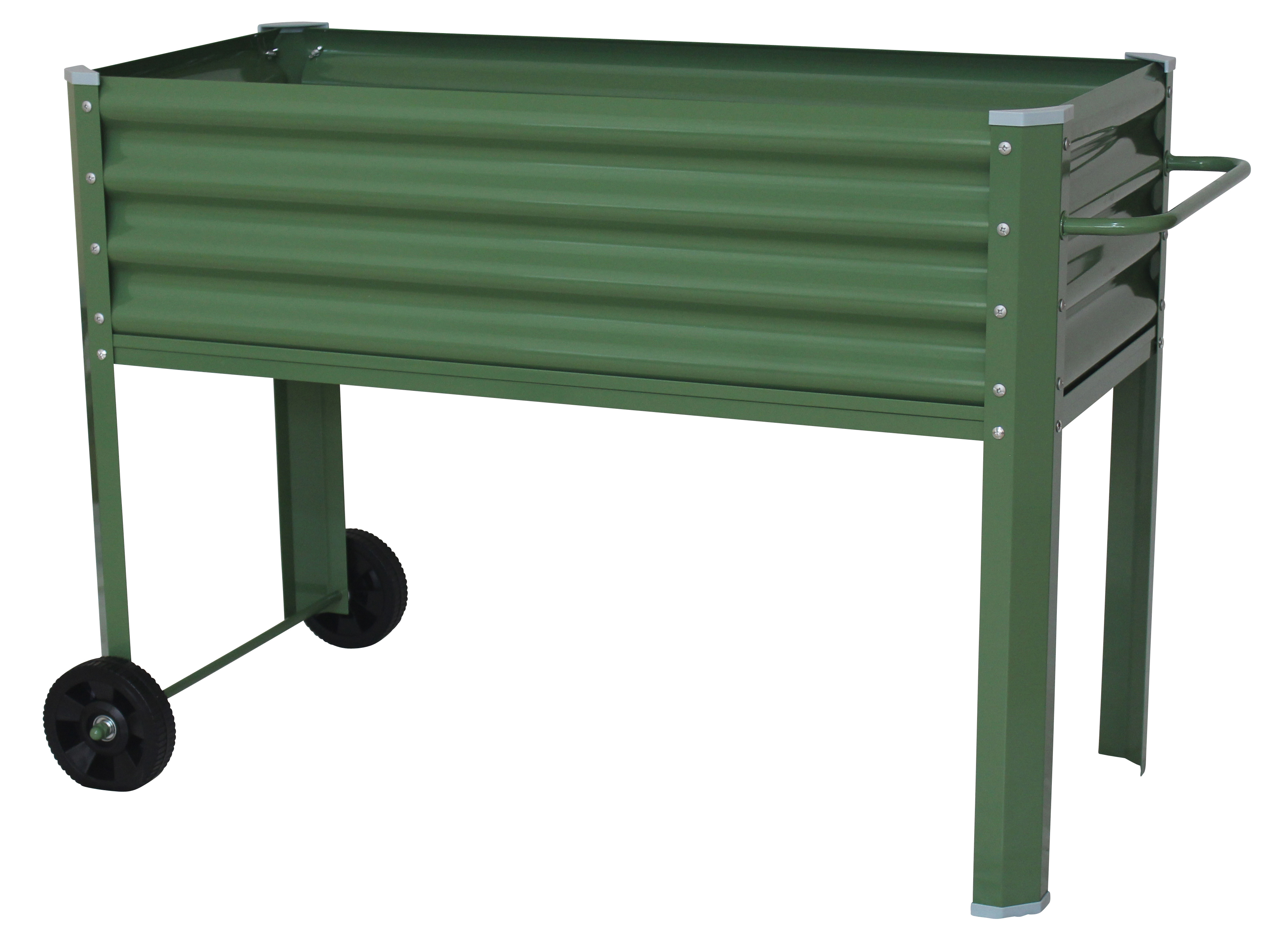Stilrent højbed med hjul i galvaniseret stål med et moderne bølgeformet design. Workmann plantekassen i grøn er både holdbar og giver et flot udtryk.