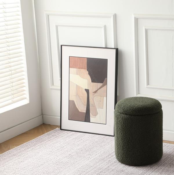 Elegant Sarda puf fra Homeville i blødt mørkegrøn teddystof. Perfekt til stue, soveværelse, entré eller walk-in closet, hvor stil og opbevaring er i ét.