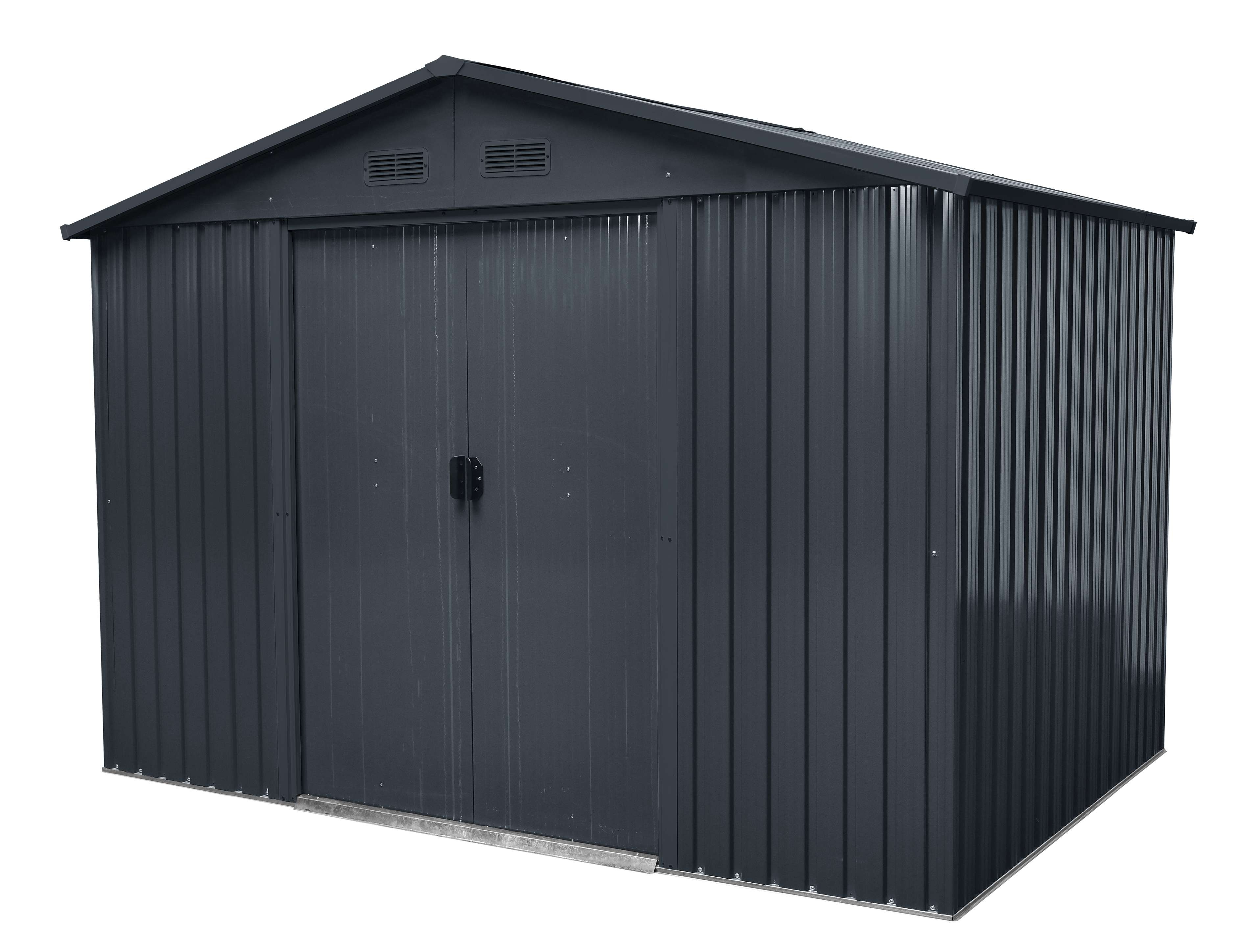 Praktisk redskabsskur med dobbeltskydedøre på 7.2m2. Haveskuret er fremstillet i antracitfarvet galvaniseret stål, og har apex-tagdesign med 4 luftkanaler.