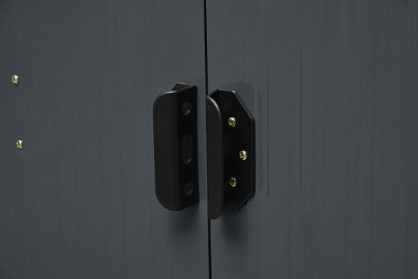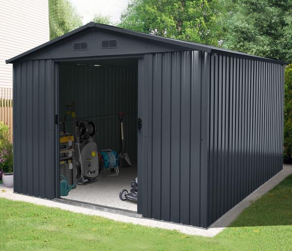 Praktisk redskabsskur med dobbeltskydedøre på 9m2. Haveskuret er fremstillet i antracitfarvet galvaniseret stål, og har apex-tagdesign med 4 luftkanaler.