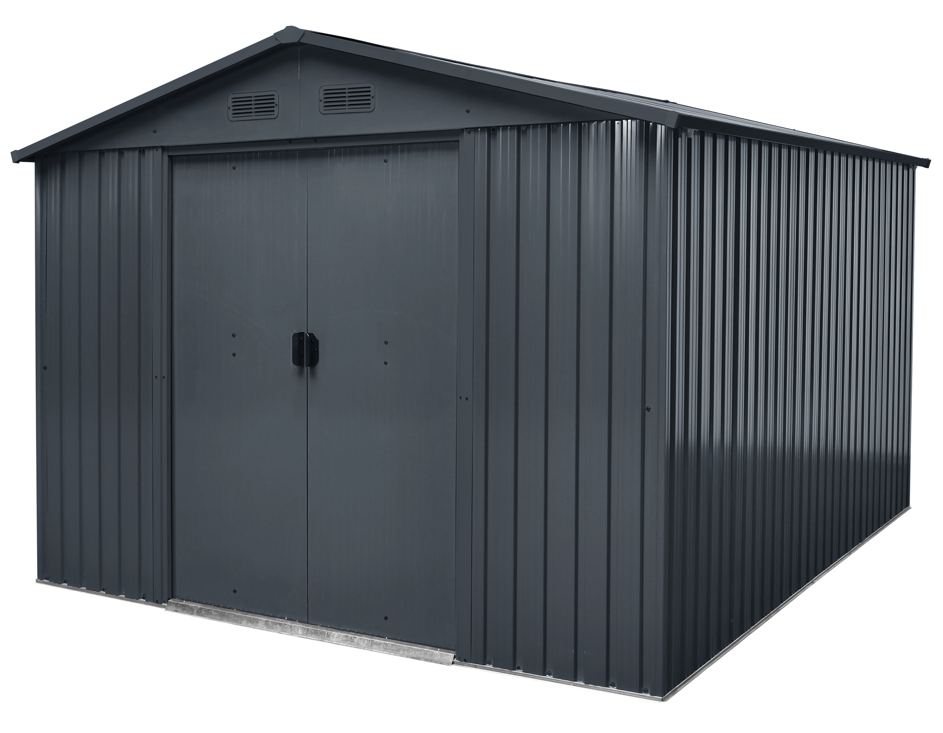 Praktisk redskabsskur med dobbeltskydedøre på 9m2. Haveskuret er fremstillet i antracitfarvet galvaniseret stål, og har apex-tagdesign med 4 luftkanaler.