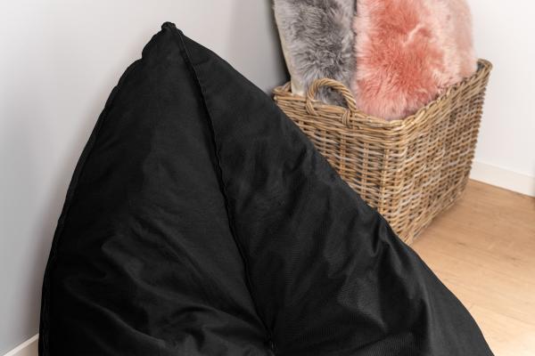 Ergonomisk oval sækkestol i sort med udvendige syninger. Sækkestolen er komfortabel og kan anvendes inde- og udendørs.
