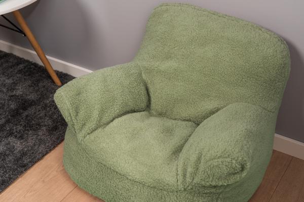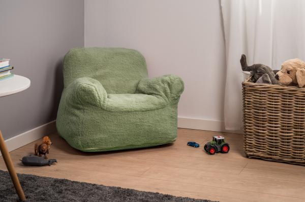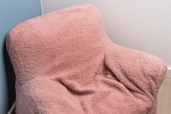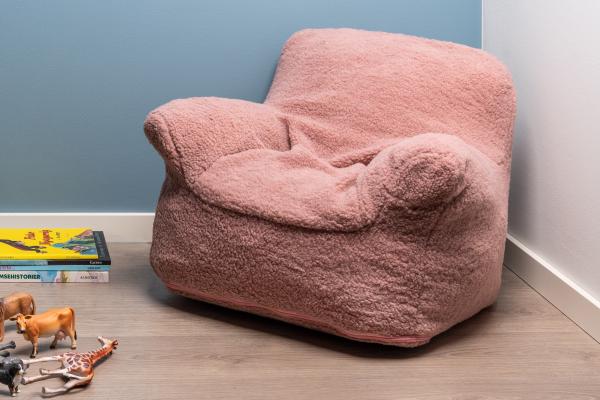 Sækkestol med høj ryg til børn i lrosa teddy stof. Sækkestolen er perfekt til spil eller afslapning på grund af formen og det ergonomiske design.