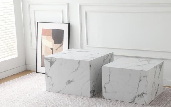 Avery sofabordsæt fra Homeville i hvid marmorprint i forskellige størrelser. Det populære og elegante marmor look er med til at pifte indretningen op.