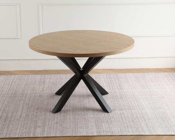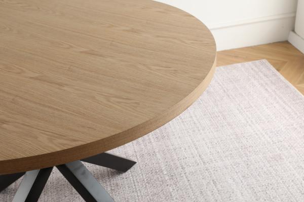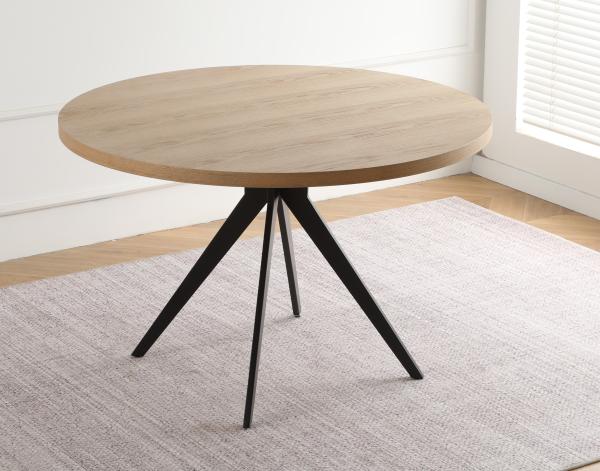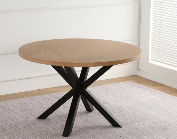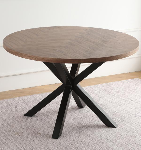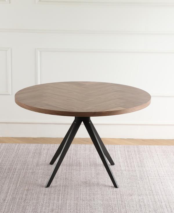 Elegant rundt spisebord med mørkebrunt sildebens mønstret bordplade. Portofino med pulverlakeret stjernestel passer ind i det skandinaviske hjem.