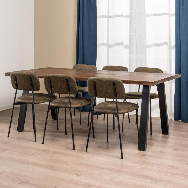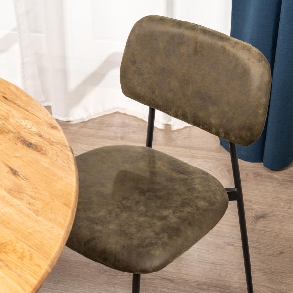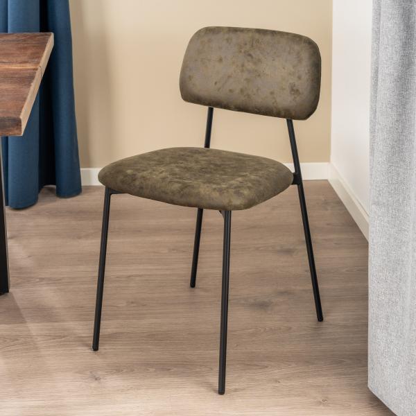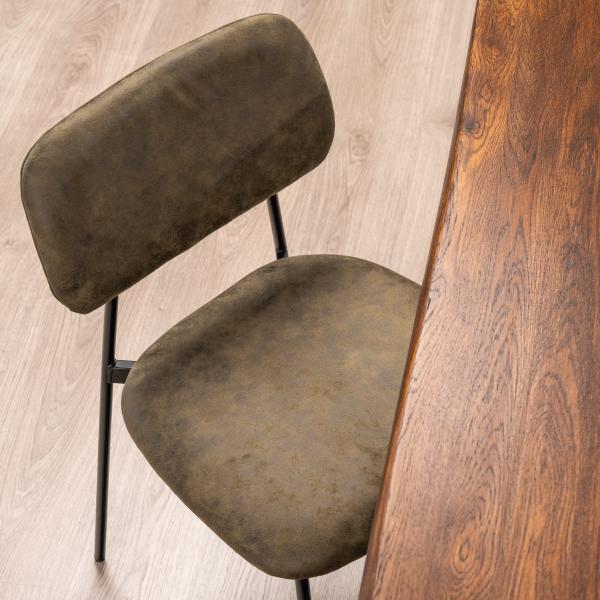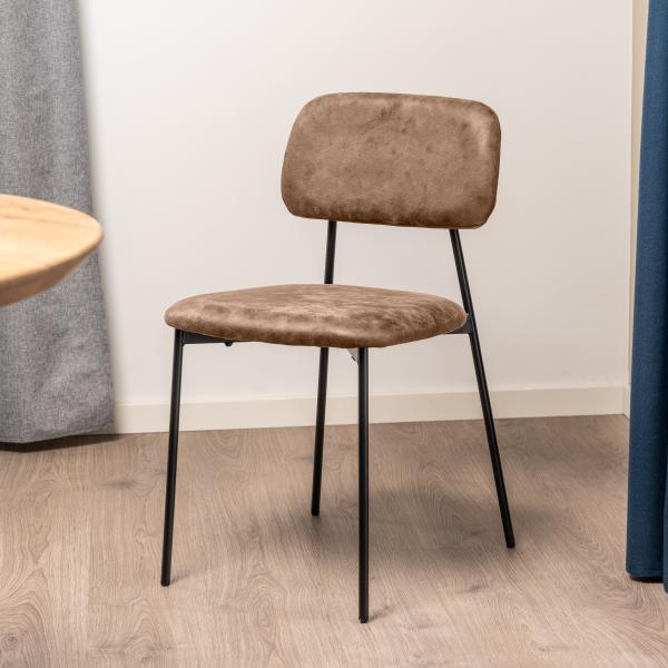 Beate spisebordsstol består af et metal skelet, skum i sæde og ryg og er betrukket med et holdbart og behageligt brun suede stof.