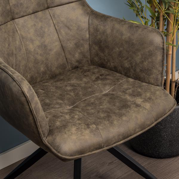 Elina er en moderne spisebordsstol fra Homeville med 360 graders drejefunktion. Stolen har behagelige armlæn, og er fremstillet i mørkegrå suede stof.