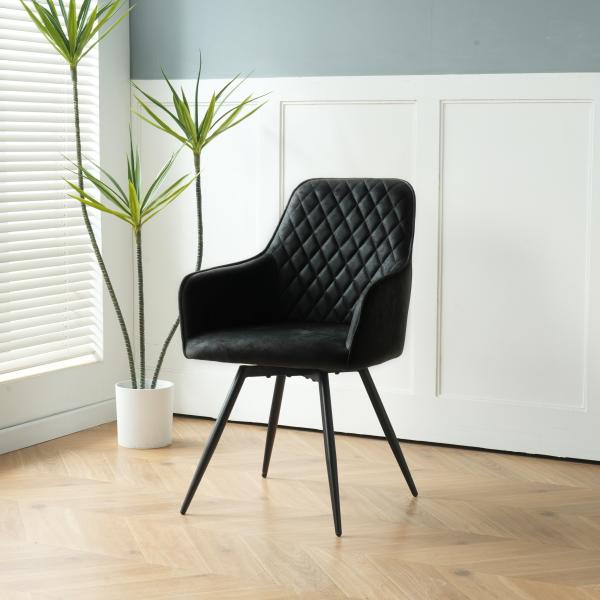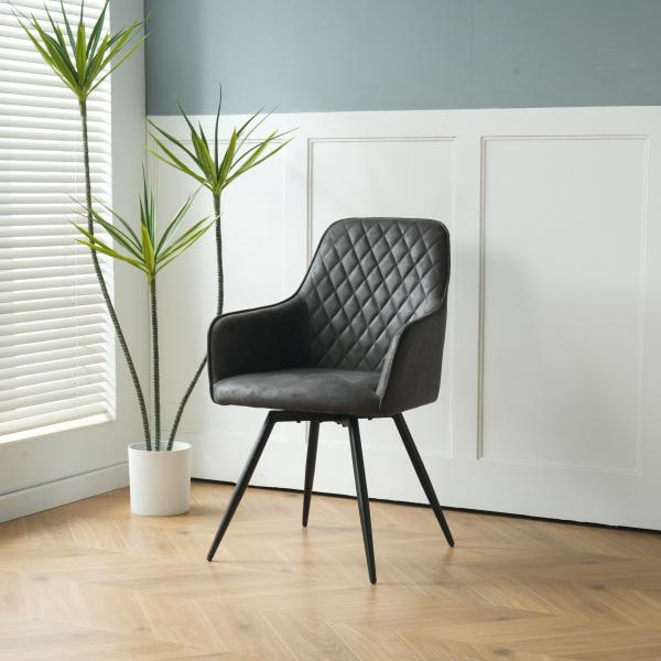 Blød og behagelig spisebordsstol i mørkegrå suede stof. Hanne spisebordsstol med 360° drejefunktion, passer godt ind i det skandinaviske hjem.