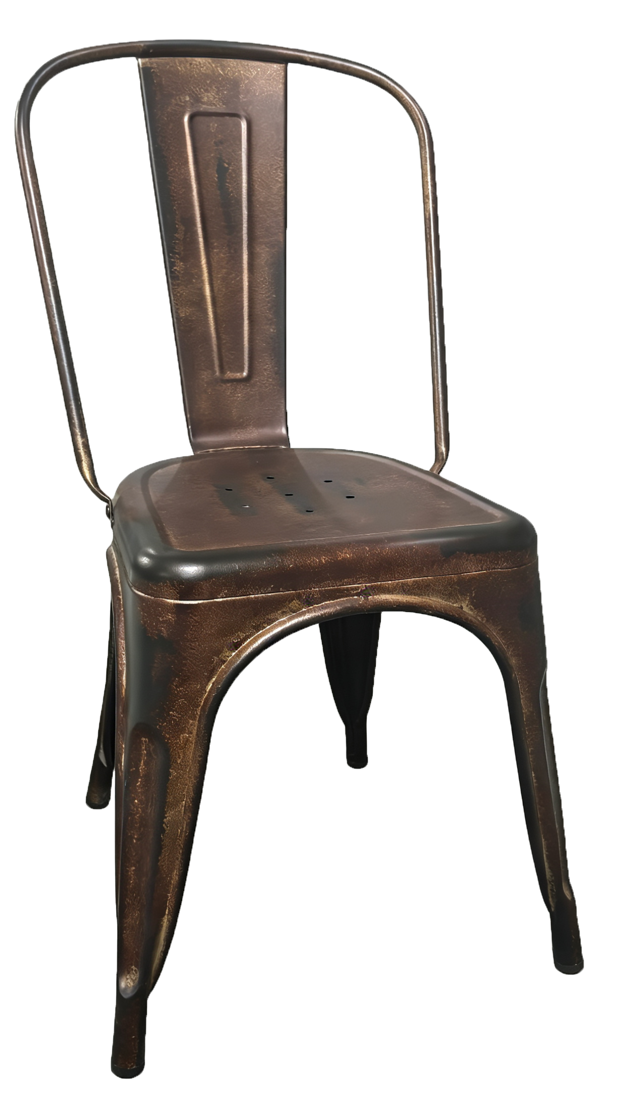 Vintage spisebordsstol i bronze malet stål fra Homeville. LaCroix spisebordsstol i bronze er praktisk at flytte rundt med da det også er en stabelstol.