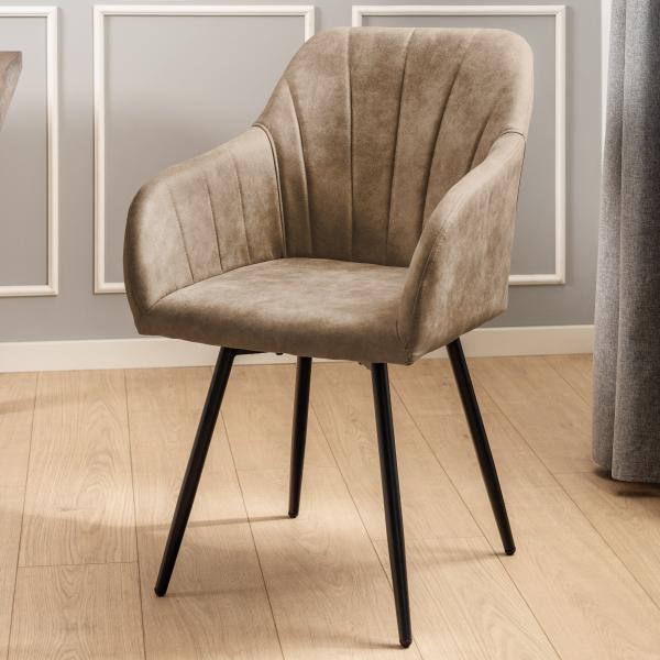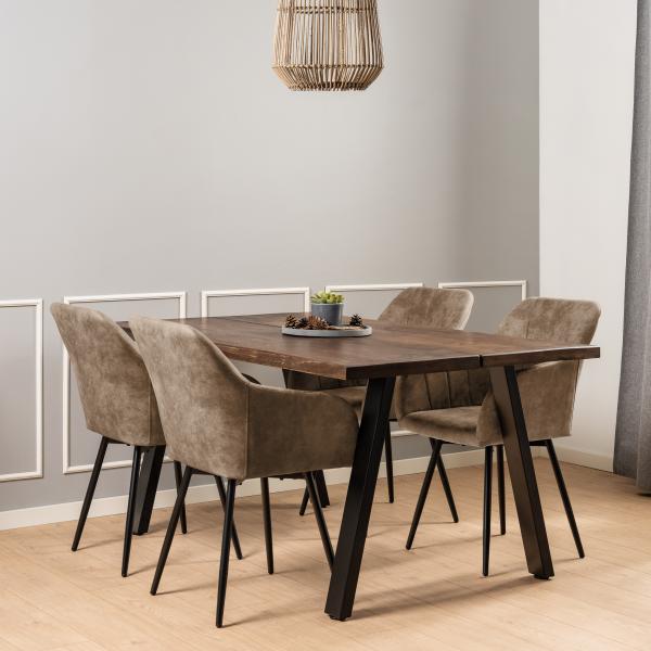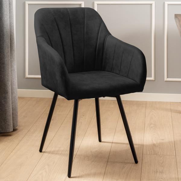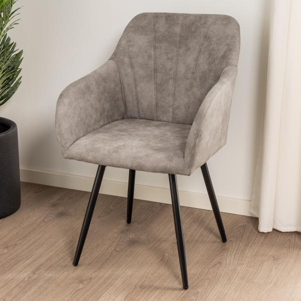 Lucy spisebordsstol består af et metal skelet, skum i sæde, ryg og armlæn og er betrukket med et holdbart og behageligt mørkegråt velour.