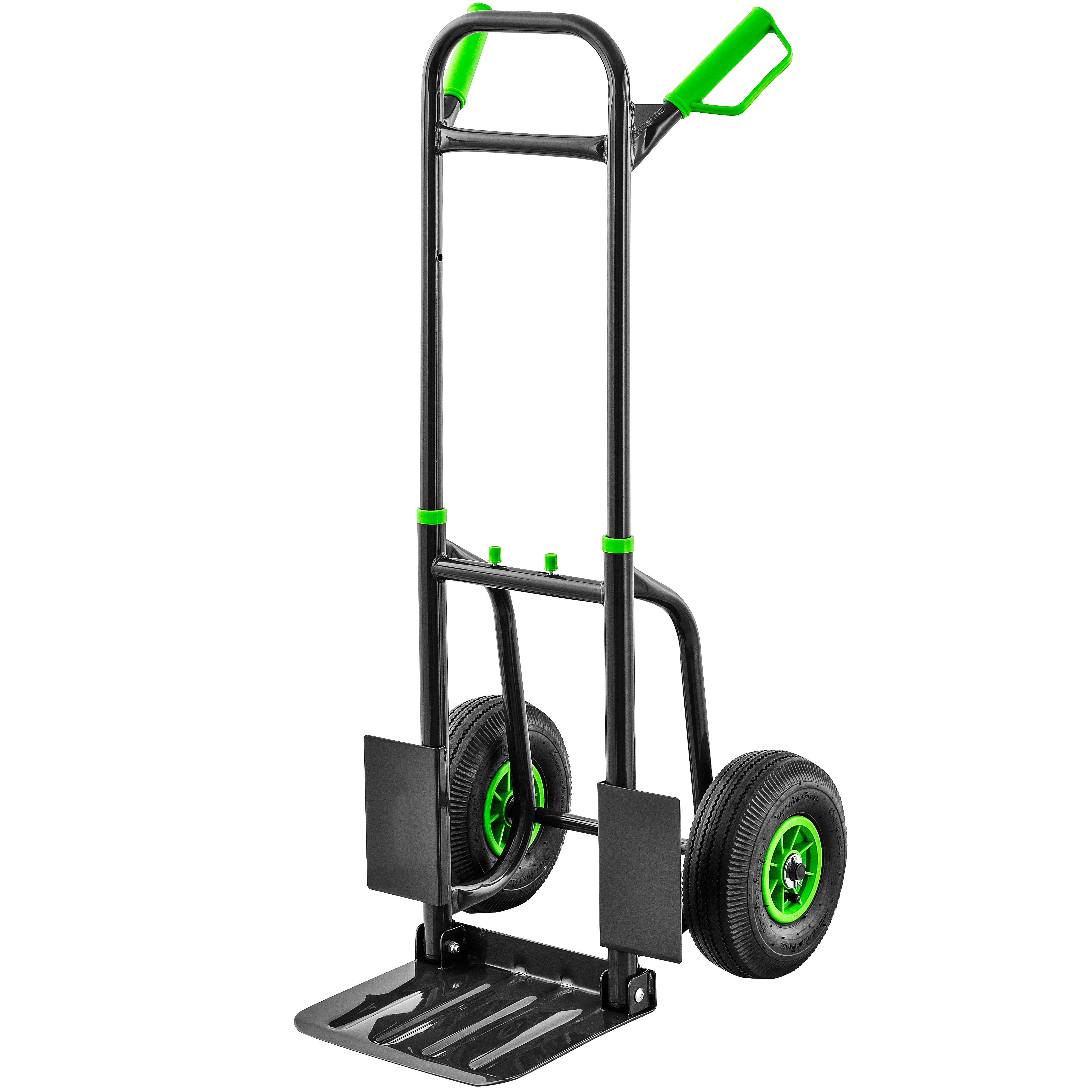 Fleksibel og sammenklappelig sækkevogn med udfaldsramme, teleskophåndtag, luftgummihjul og håndtag med knobeskyttere.